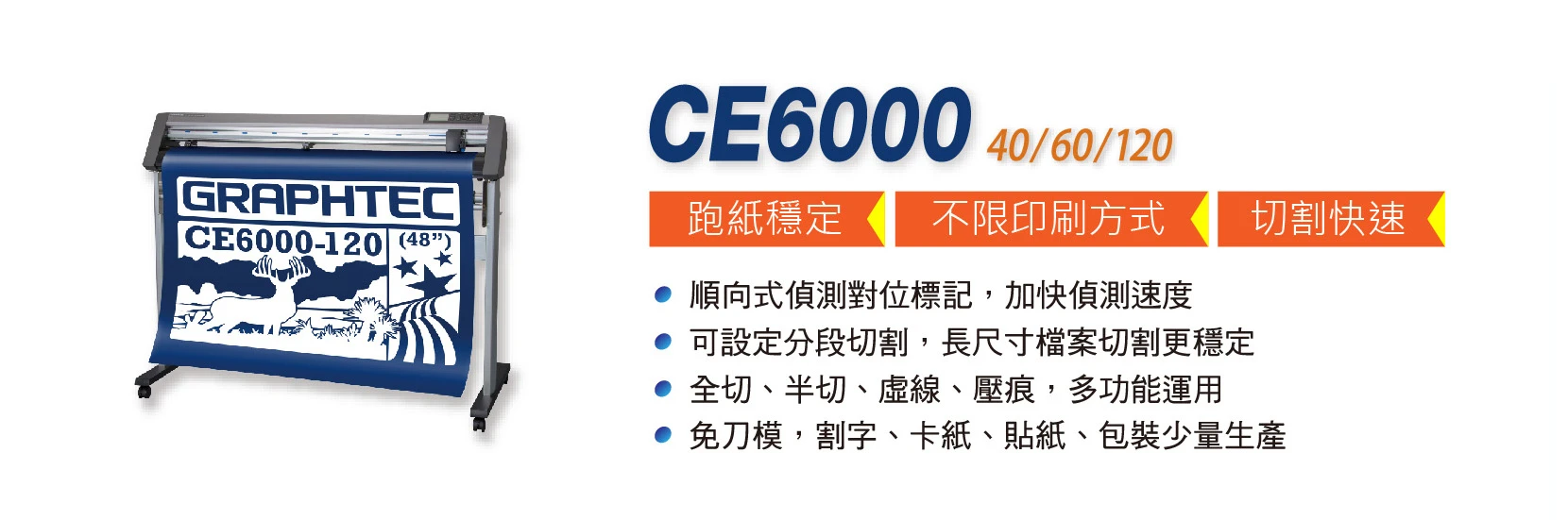 不管是雷射、噴墨、網版印刷、希德或常見紙材,皆可切割。擁有最新對位切割系統,即使遇較厚、不易斷的材質,可在同一位置上重複切割將材料切斷。